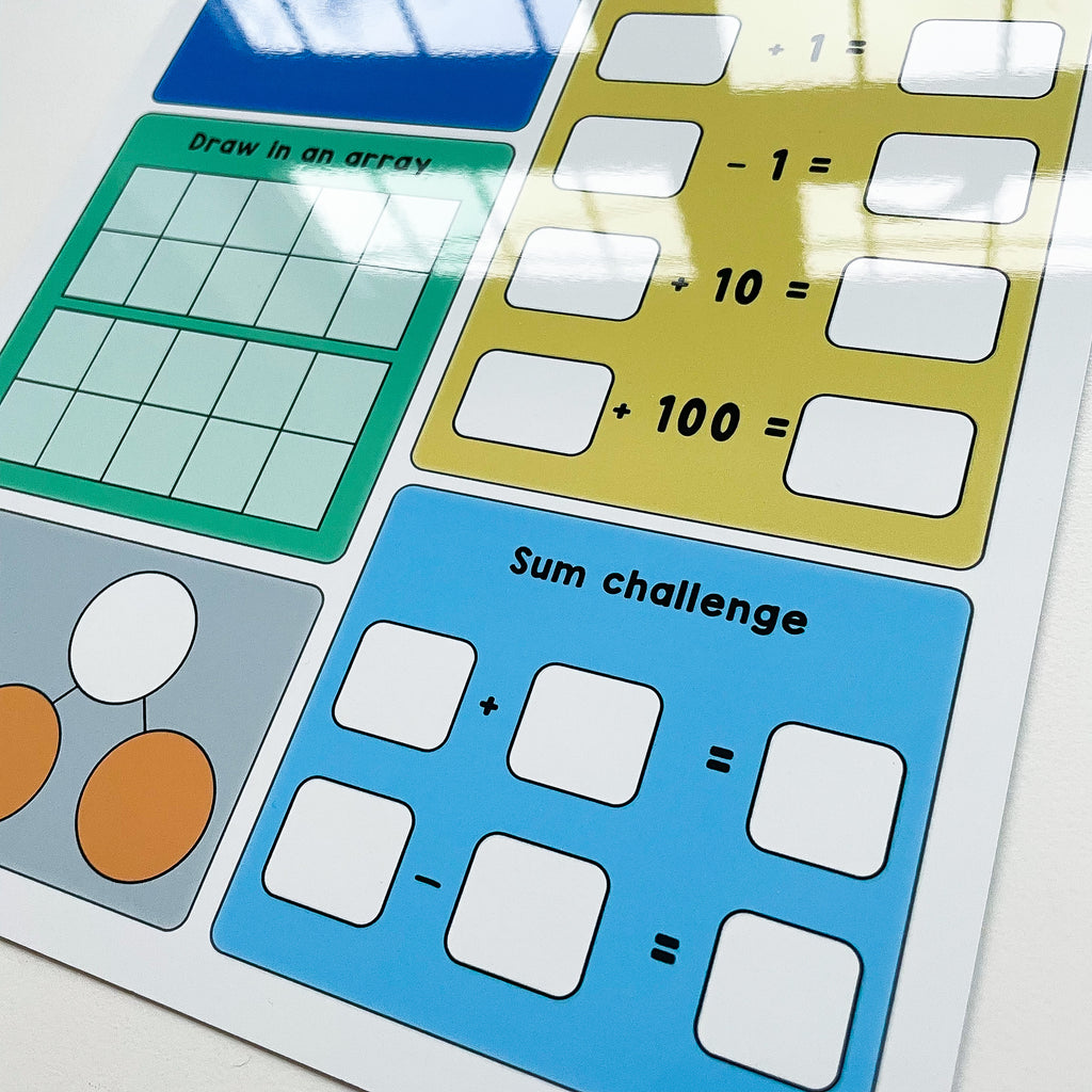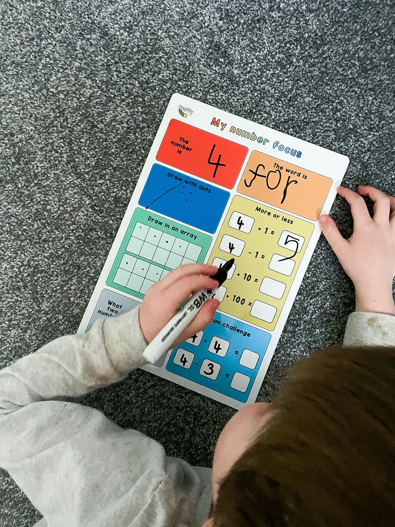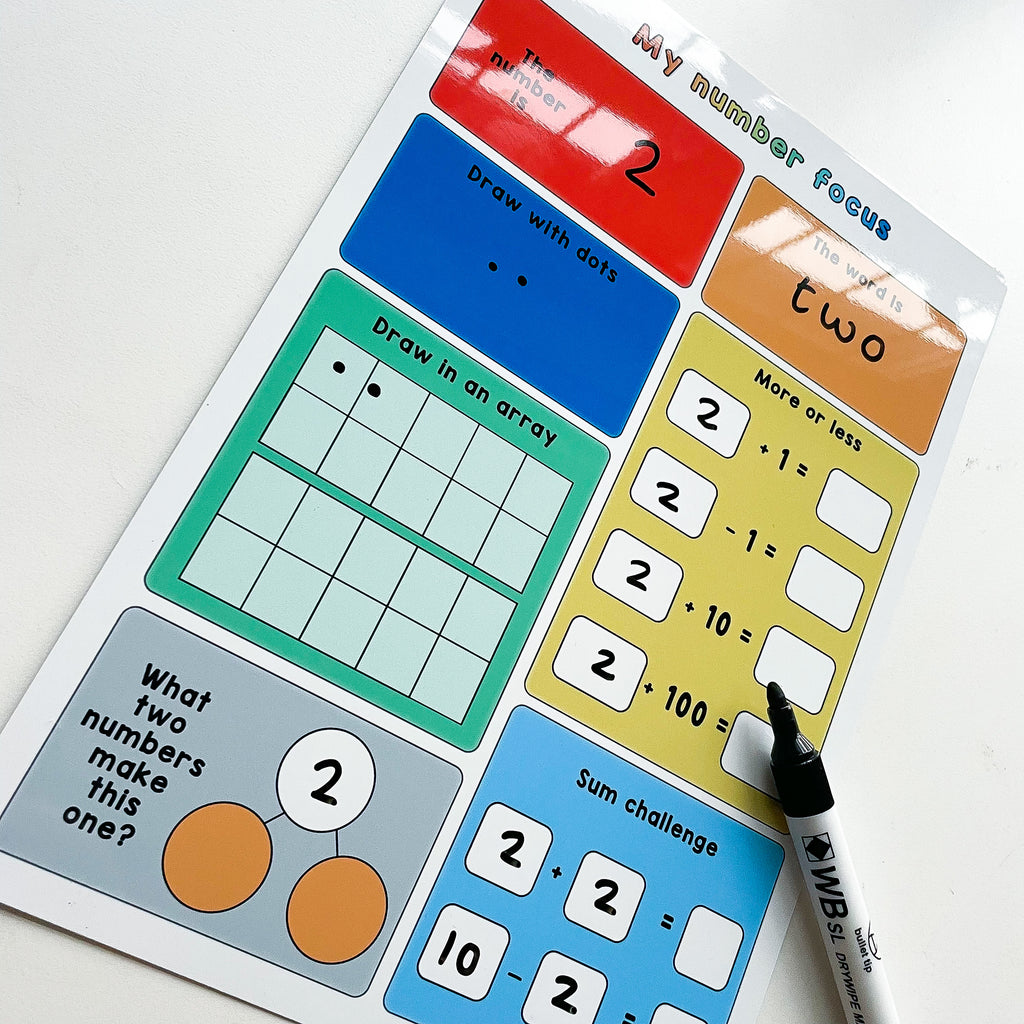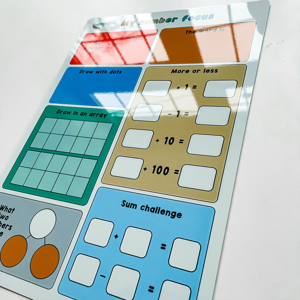Children can practice a number focus daily using this wipe clean whiteboard to do sums and challenges.