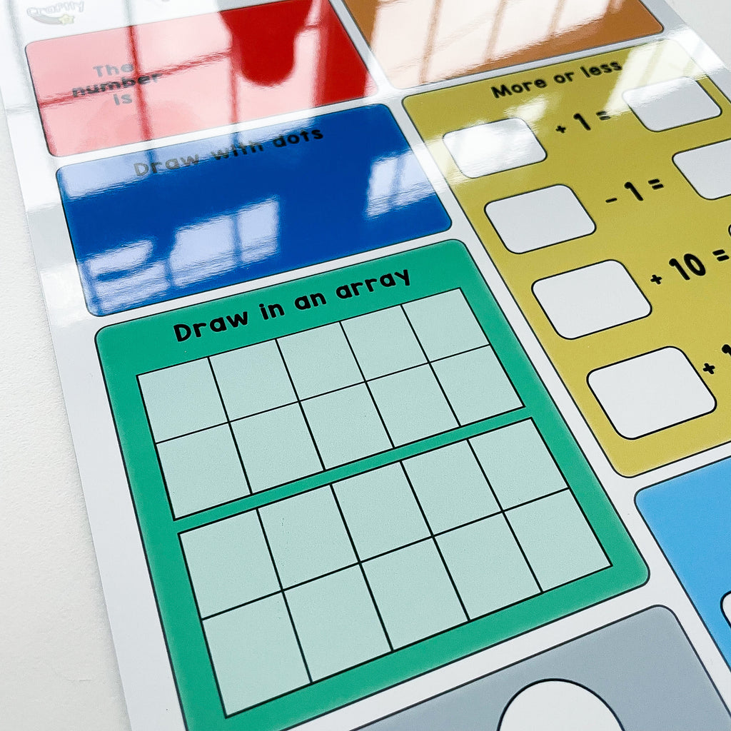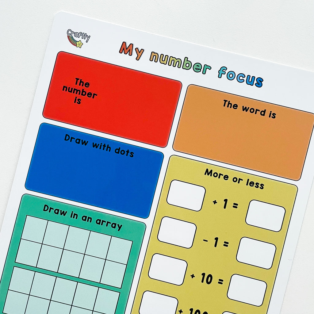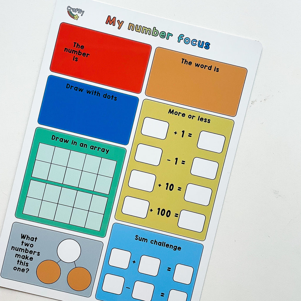 Children can practice a number focus daily using this wipe clean whiteboard to do sums and challenges.