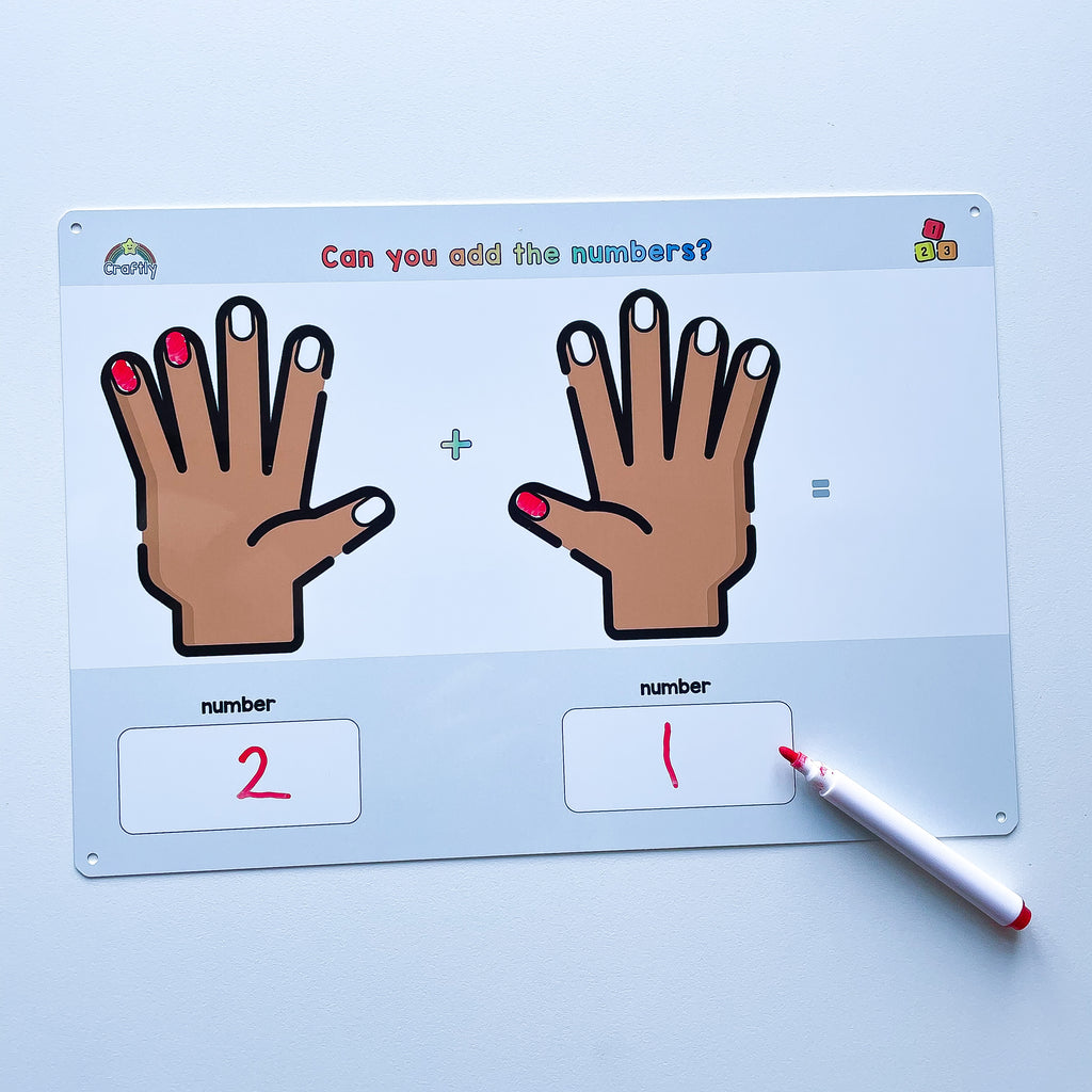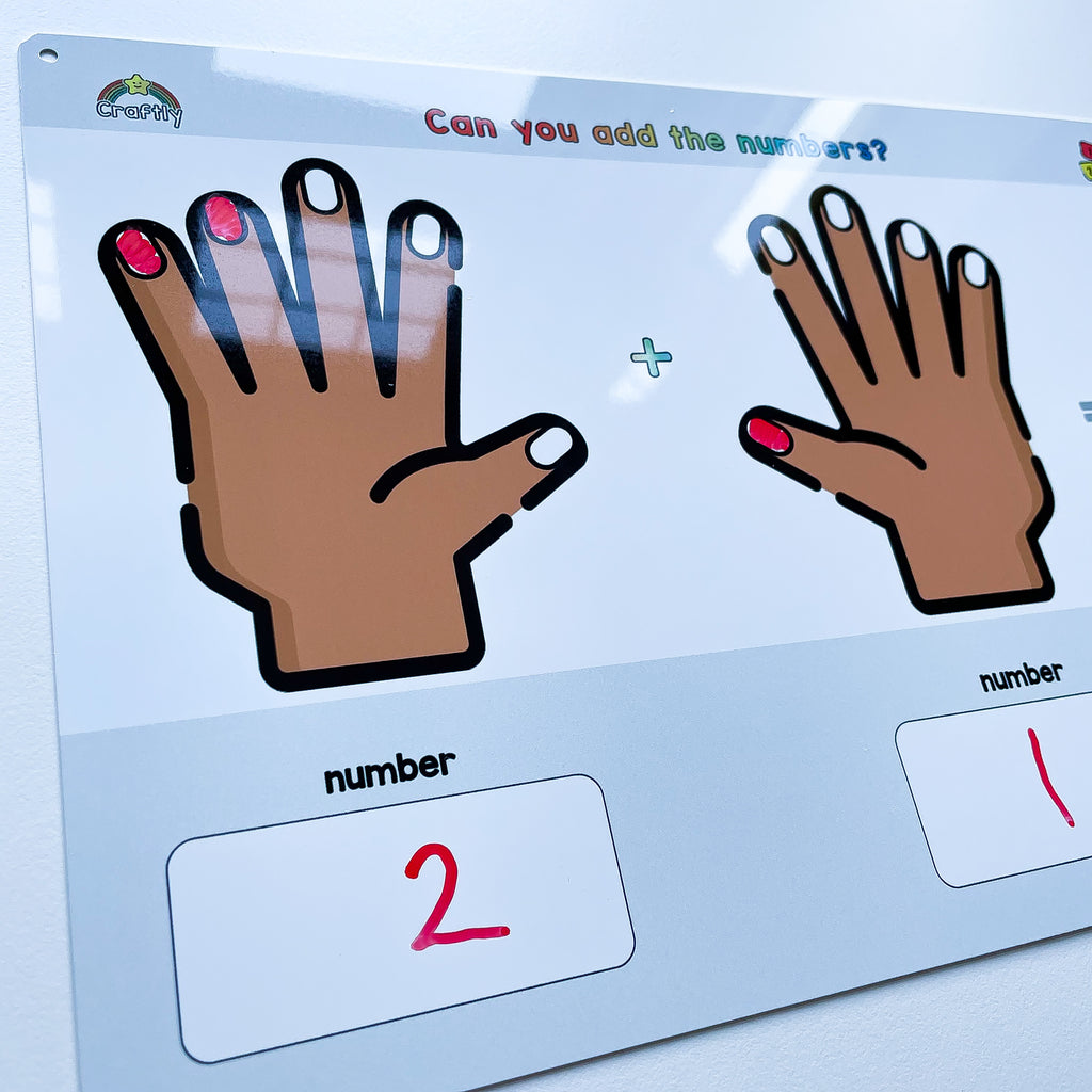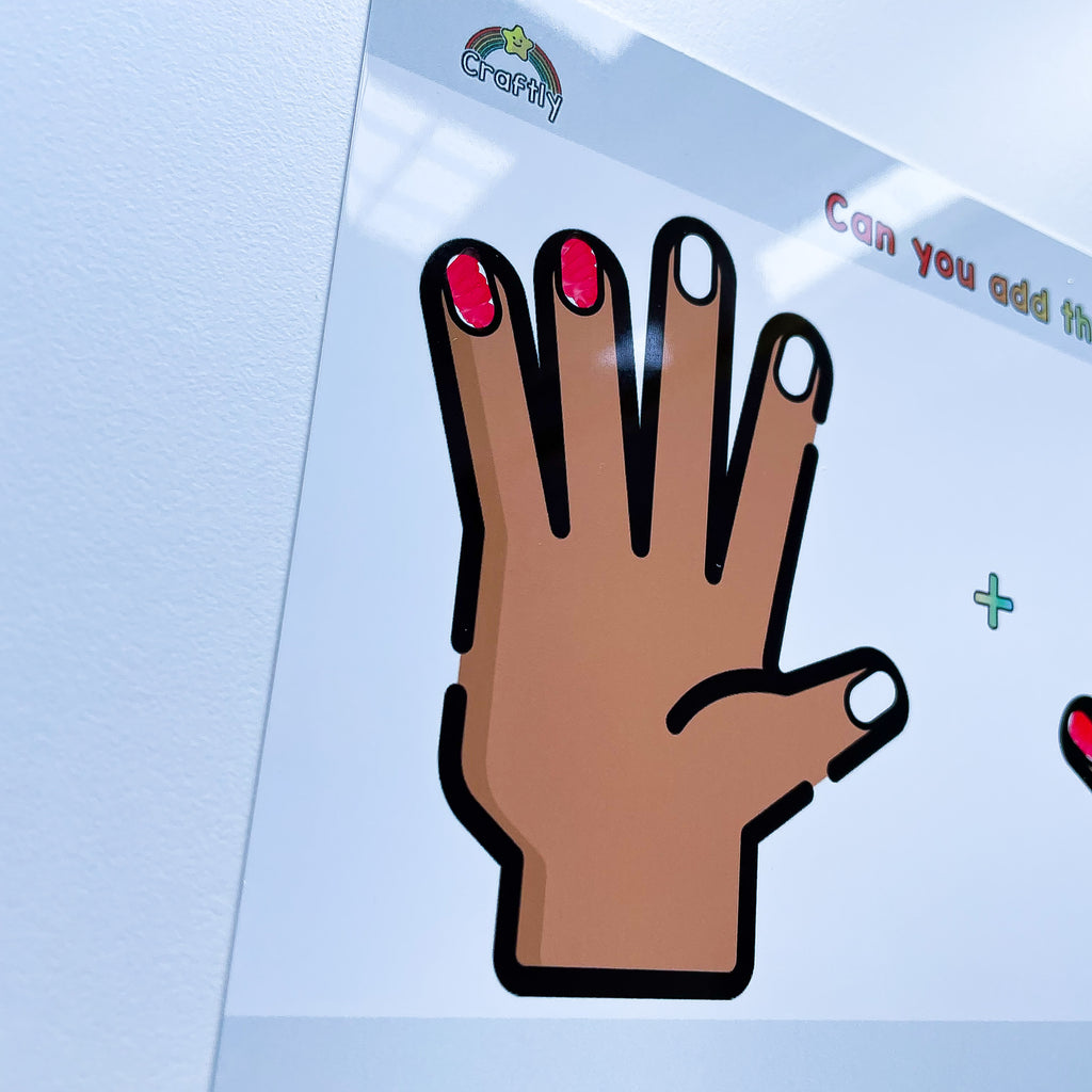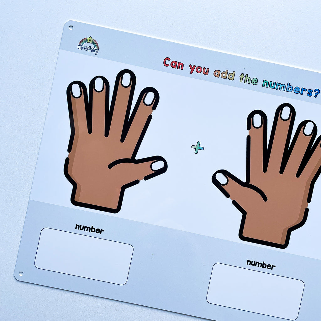 Adding to 10 is an exercise used for reception and EYFS children to get them familiar with numbers and counting. The picture of hands is useful and interactive for small children as they can see the visual of real hands and fingers used to count.