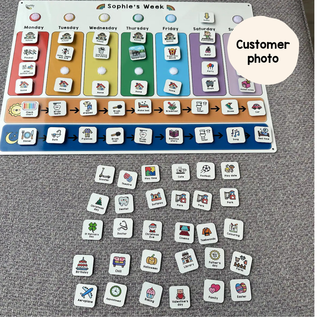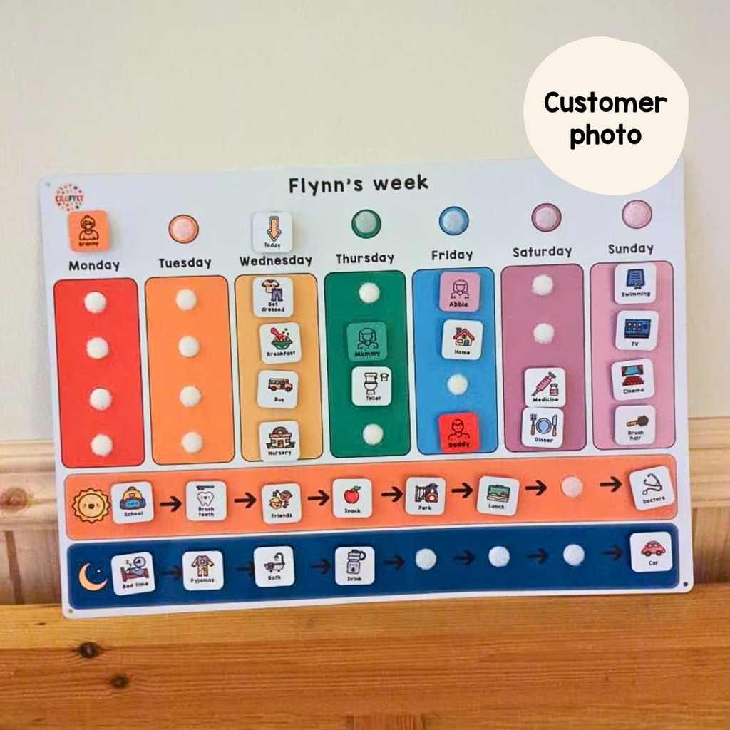 Crafted from durable aluminium, this vibrant A3 planner makes routines fun with custom velcro picture tokens for daily tasks and routines. Personalise with your child’s name and favourite colours to make organising engaging and stress-free. Ideal for creating visual schedules that support routine-building, reduce anxiety, and promote independence—especially for children who benefit from structured, predictable days.