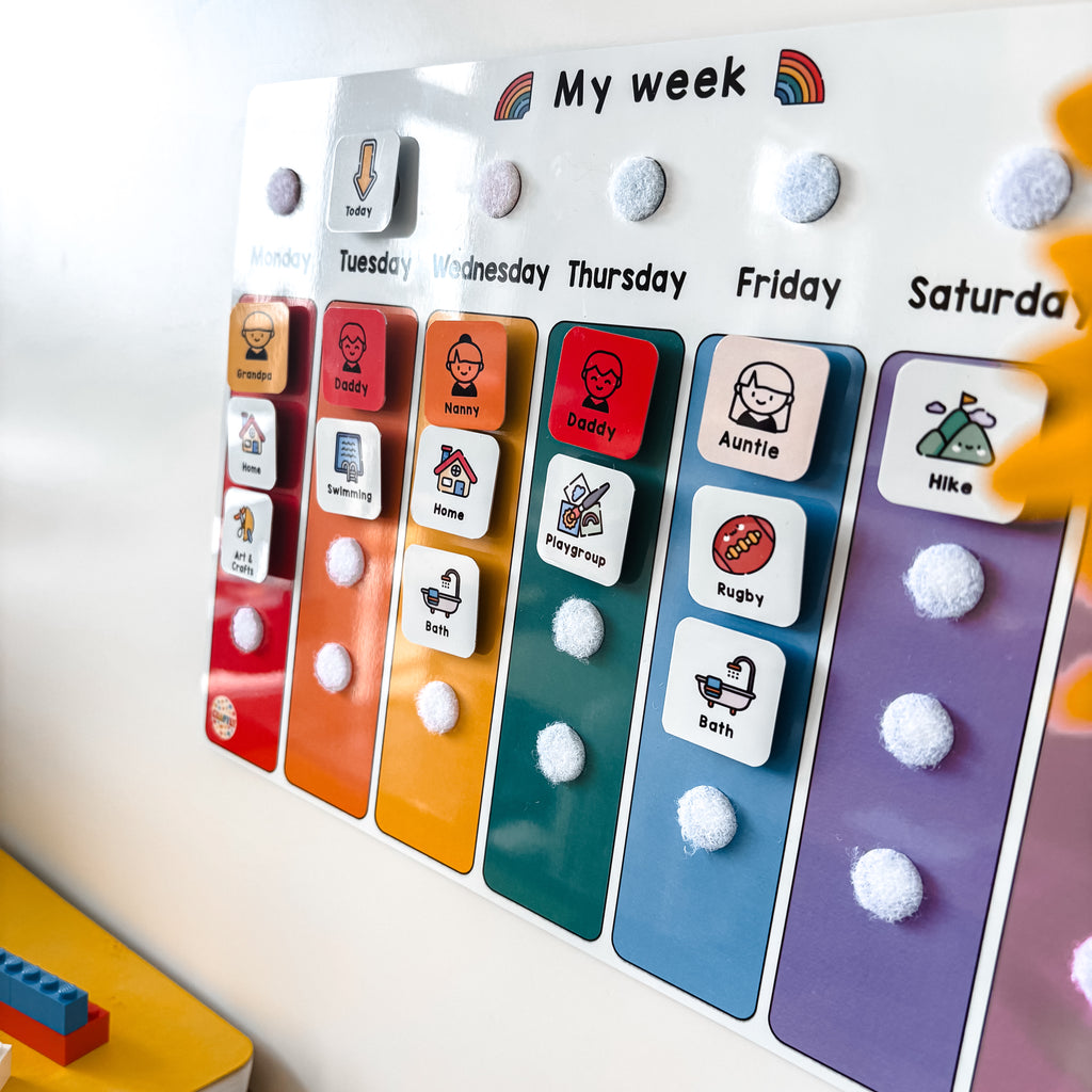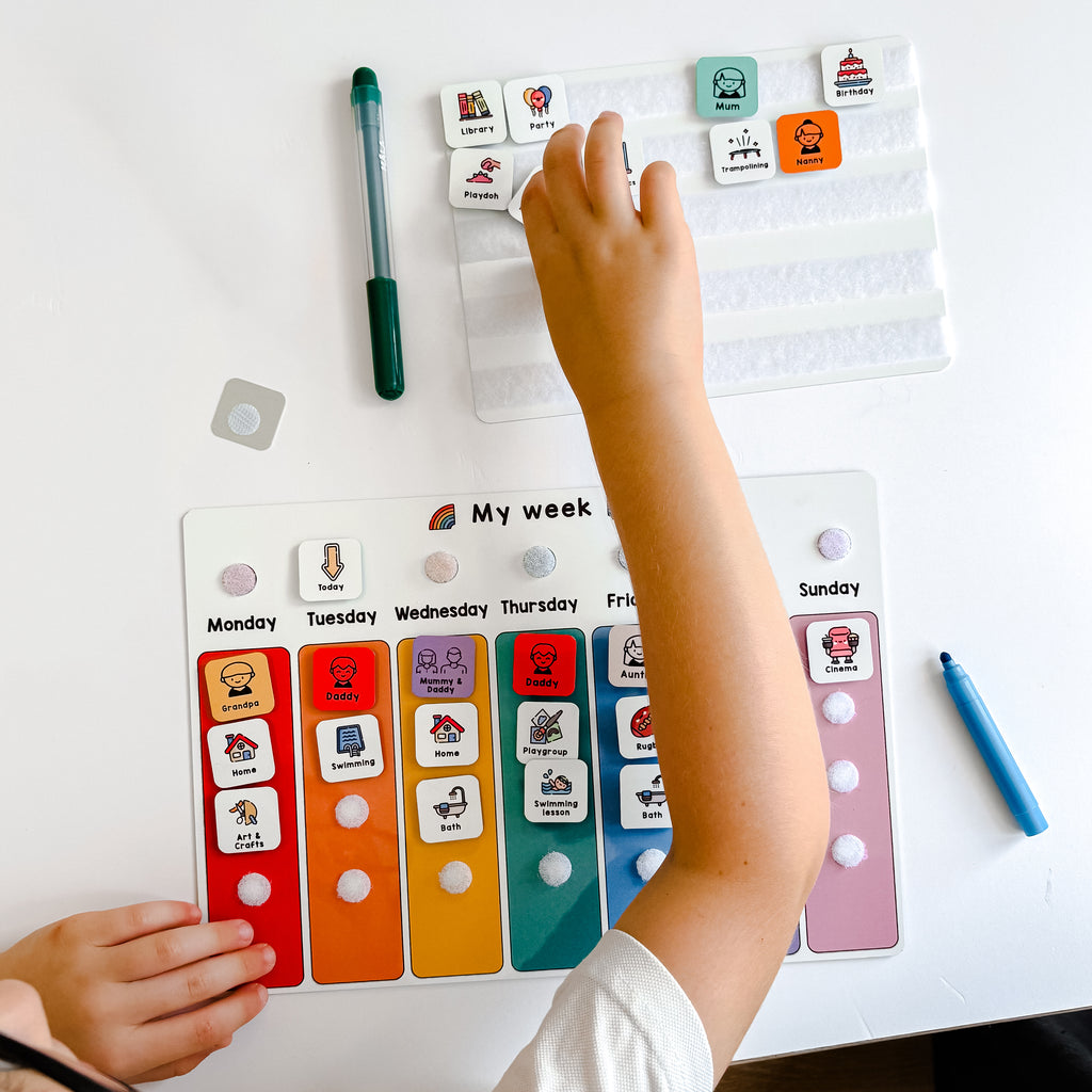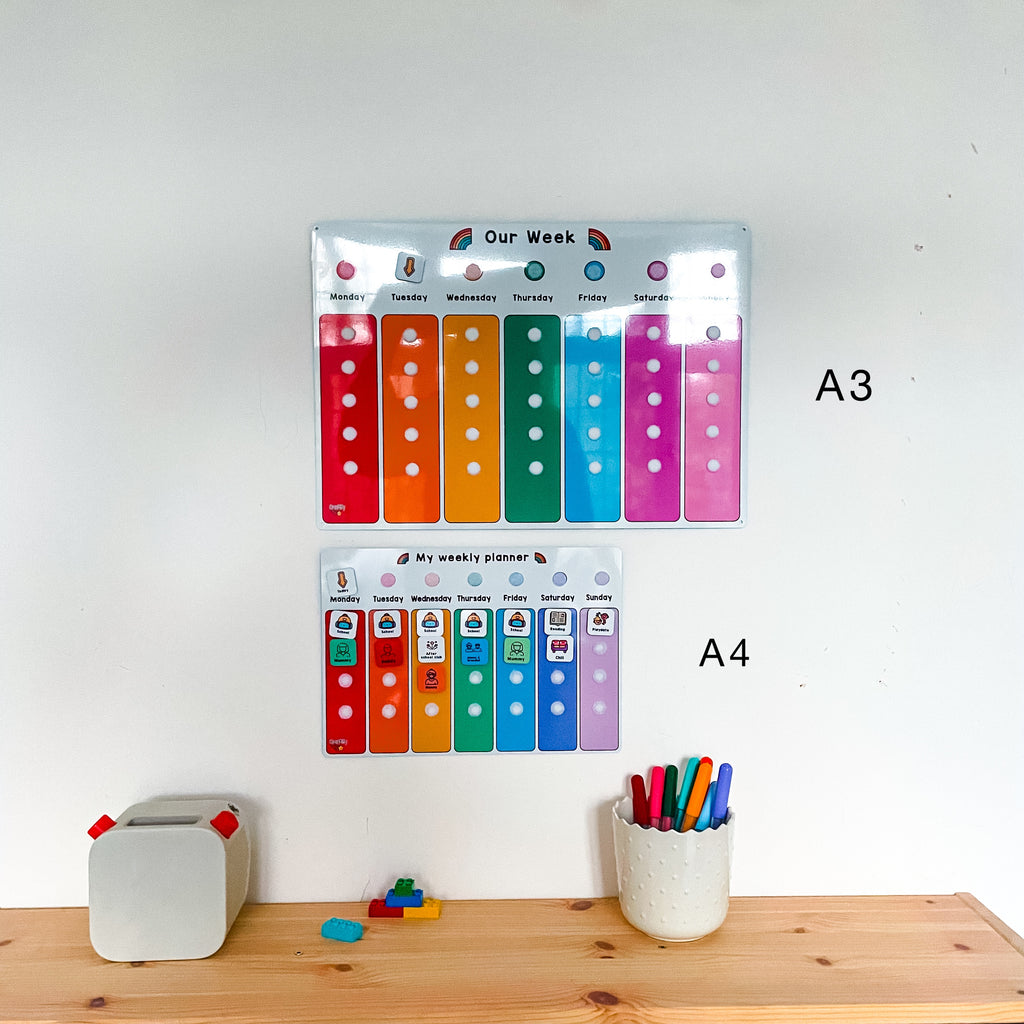 Our weekly planner and square tokens are printed onto smooth 0.5mm aluminium metal with rounded corners to keep little hands safe.