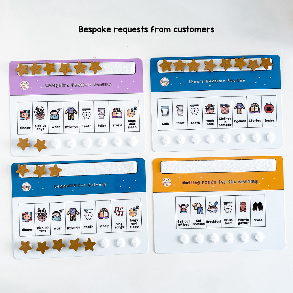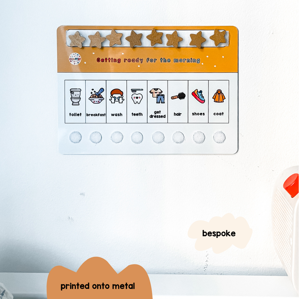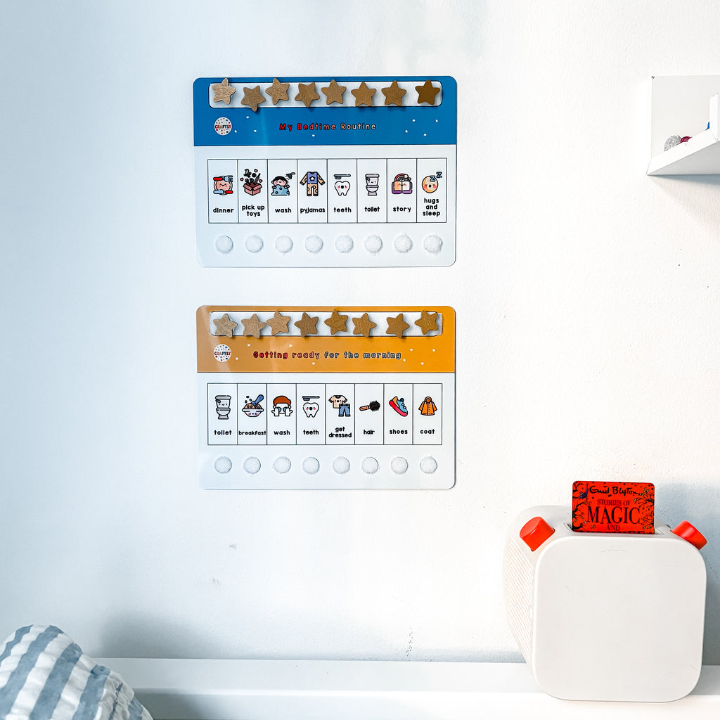 Our mini routine board includes 8 golden wooden stars all safely stored at the top of the board on a velcro strip.