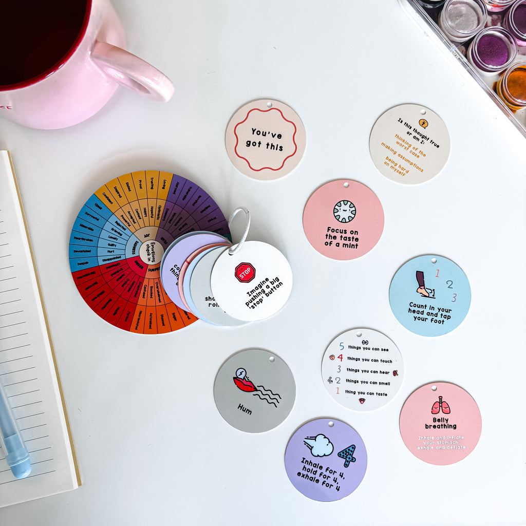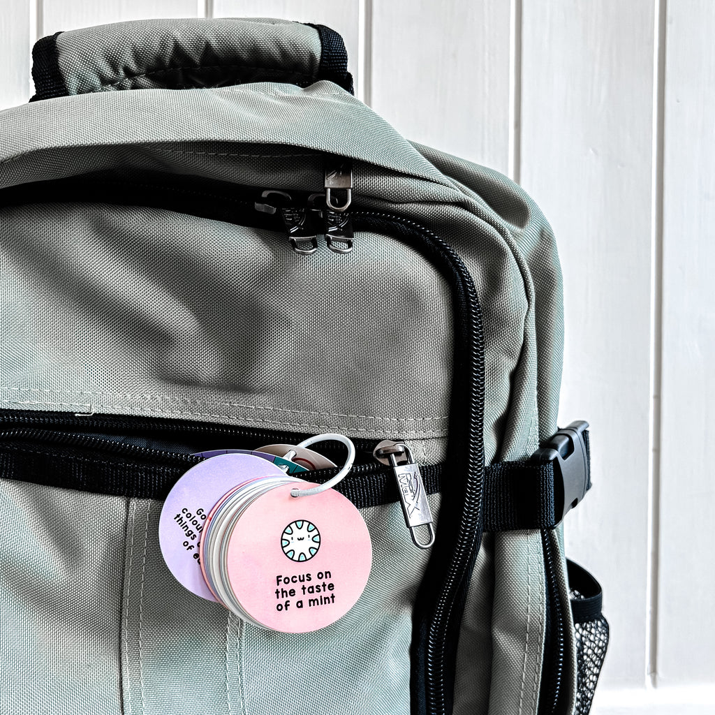 Meet your pocket-sized calm in a storm. This dreamy little keyring is packed with soft, visual grounding prompts to soothe anxious minds and gently bring you back to the here and now. Each charm is beautifully illustrated and easy to follow — whether you’re tracing a squiggle, spinning the emotion wheel, or focusing on the taste of a mint. Designed with care to support visual learners, anxious moments, and those who need a comforting pause throughout the day. A magical little tool for your bag, desk or lanyard.