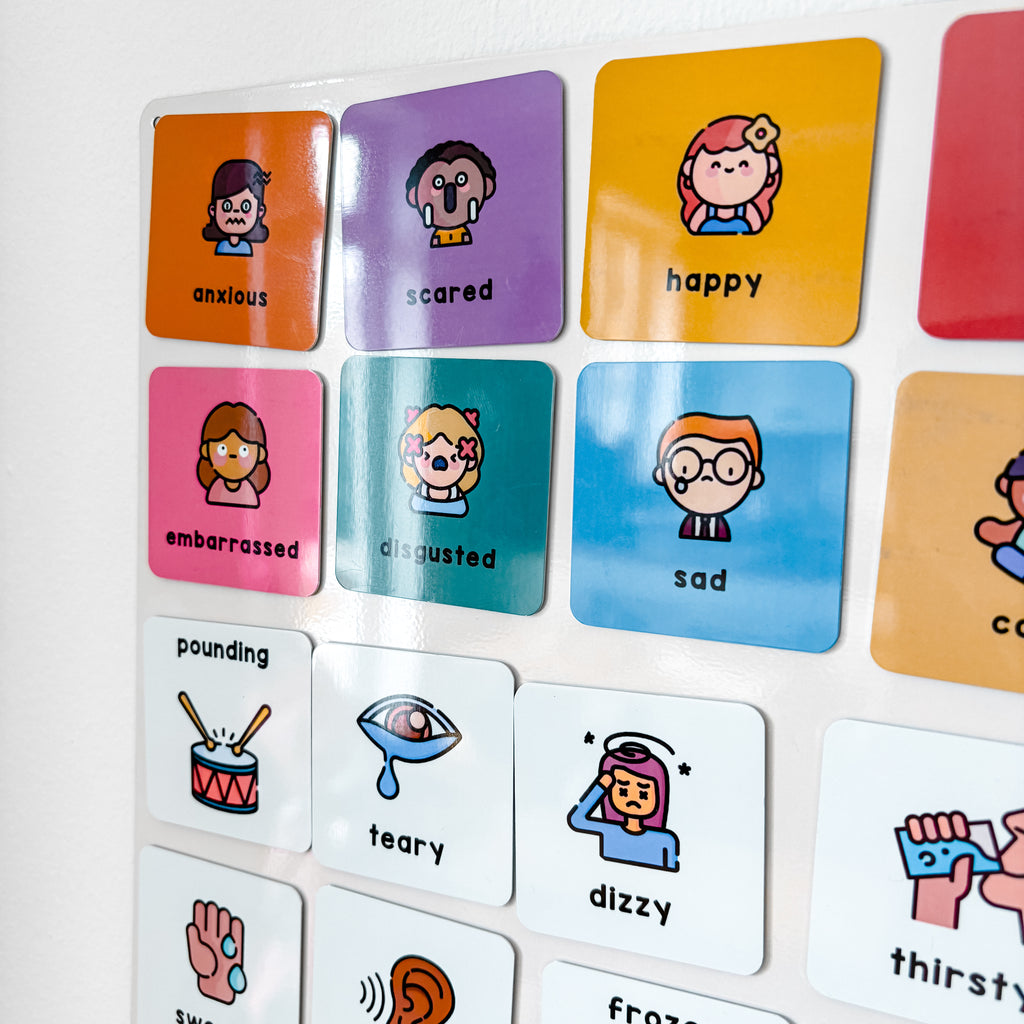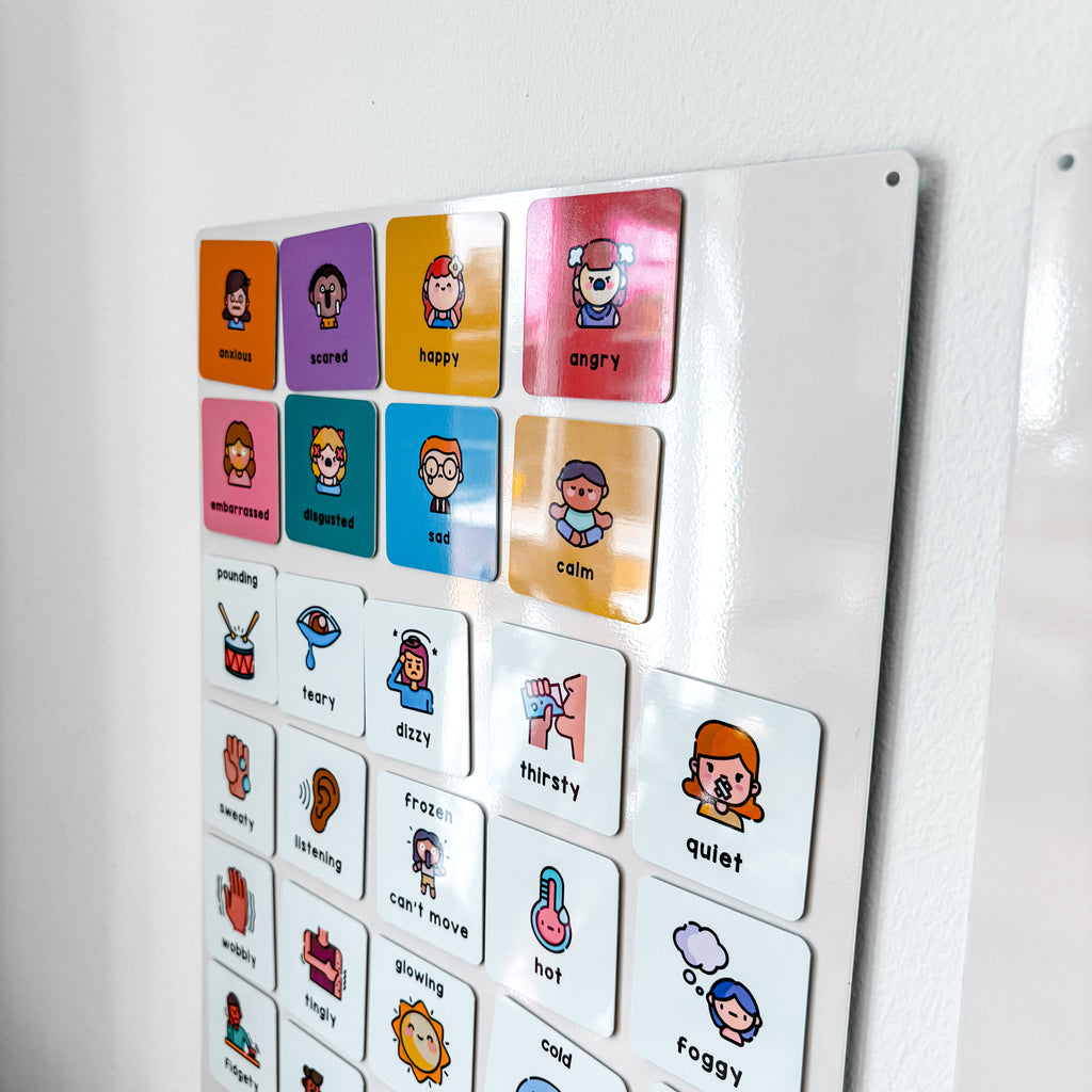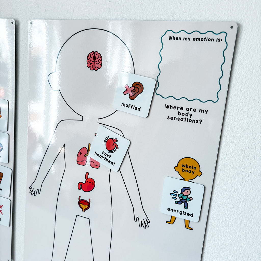 This large A3 magnetic board set is designed to help children and adults explore where they feel emotions in their bodies. One board features a full-body outline, while the second holds the magnetic tokens, making it easy to choose and place them. This interactive format encourages the development of interoceptive awareness—our internal sense that helps us recognise signals like a fluttery stomach, tight chest, or feeling thirsty. Ideal for building emotional literacy and supporting self-regulation, it's a valuable tool for classrooms, therapy spaces, or home use.