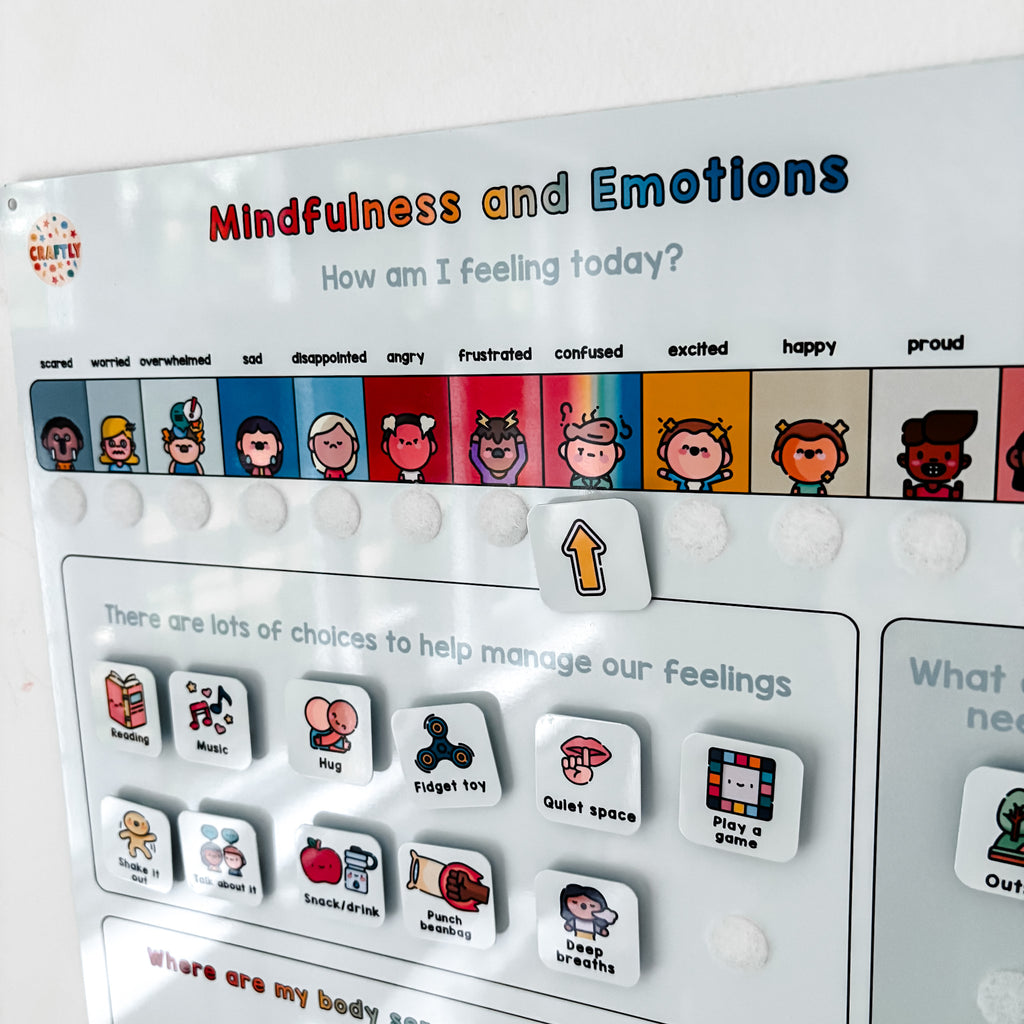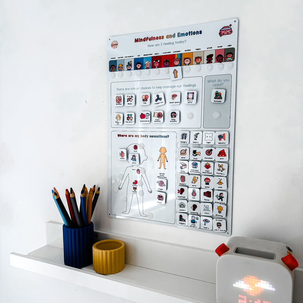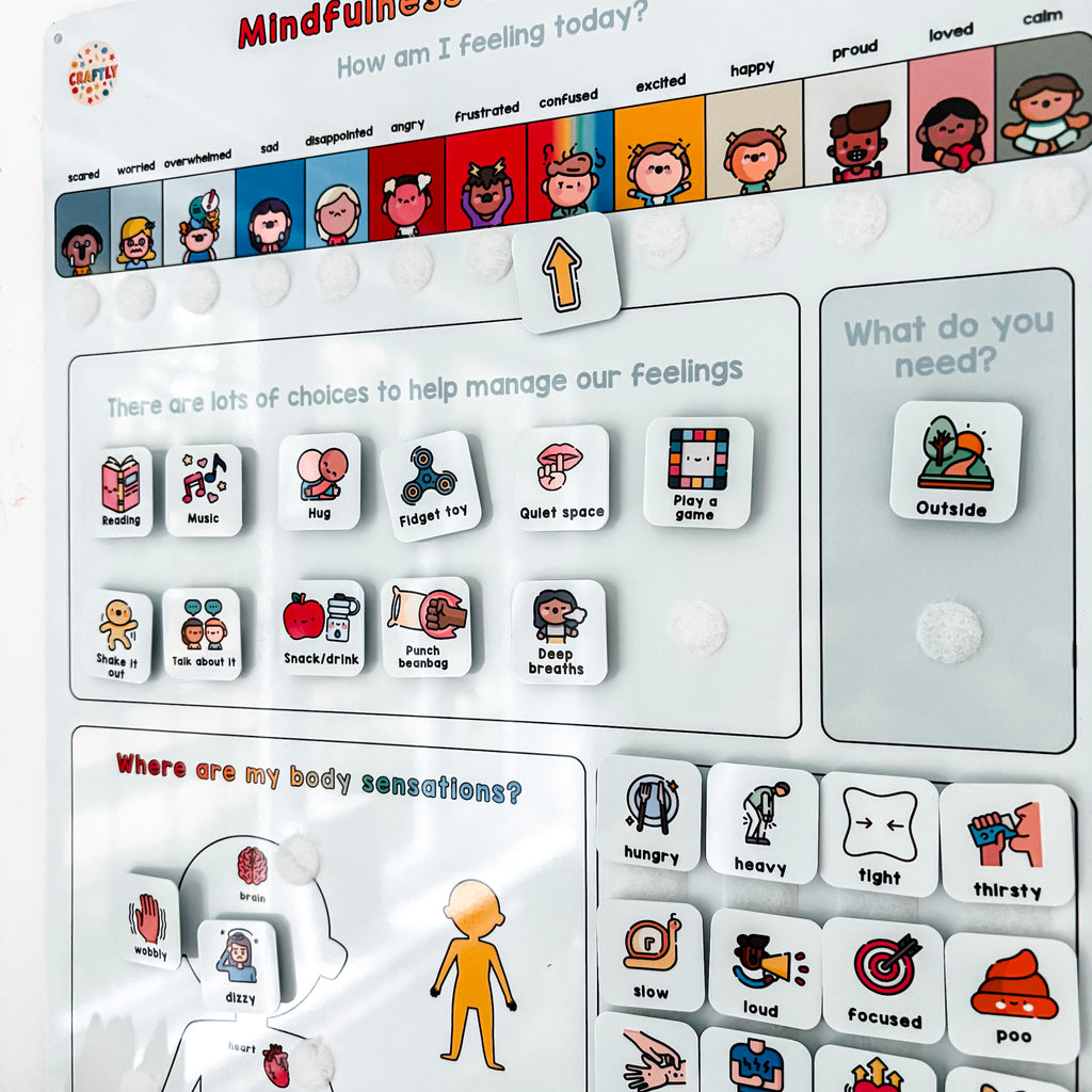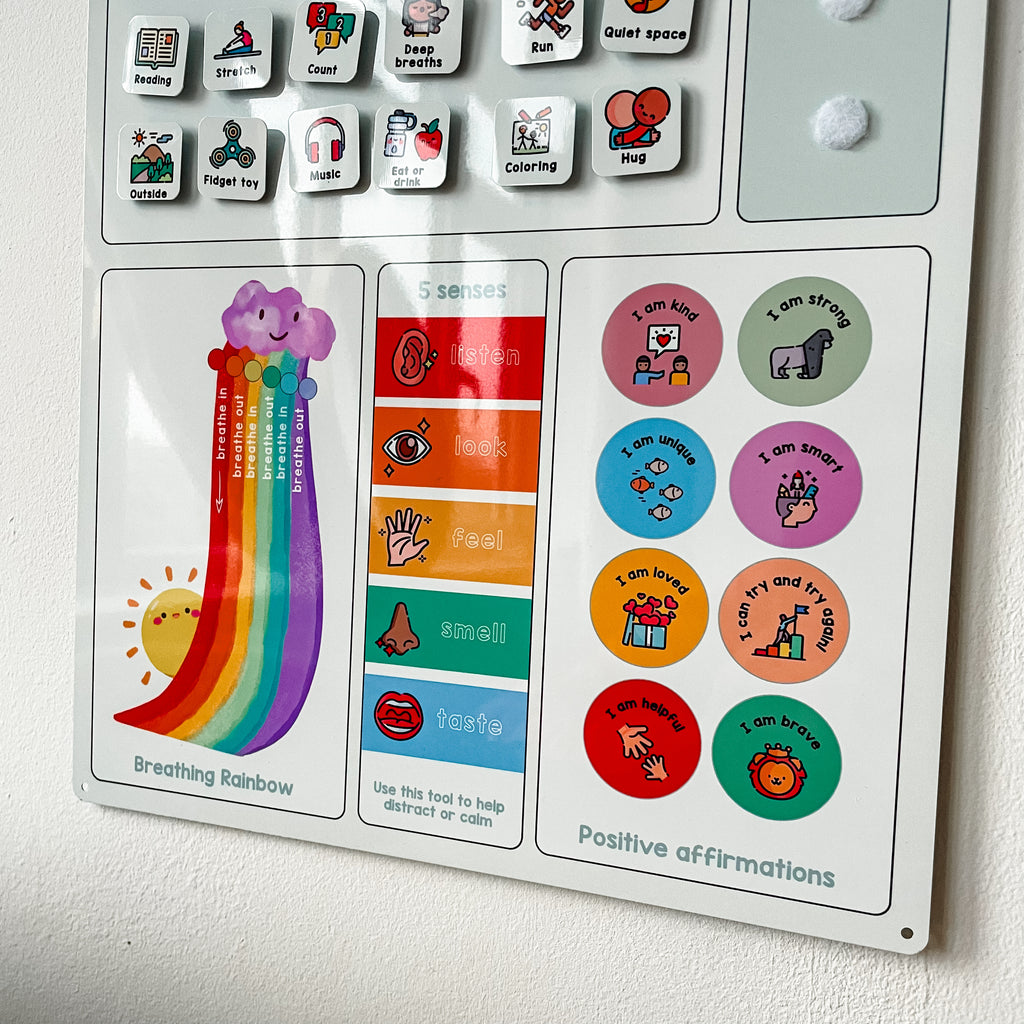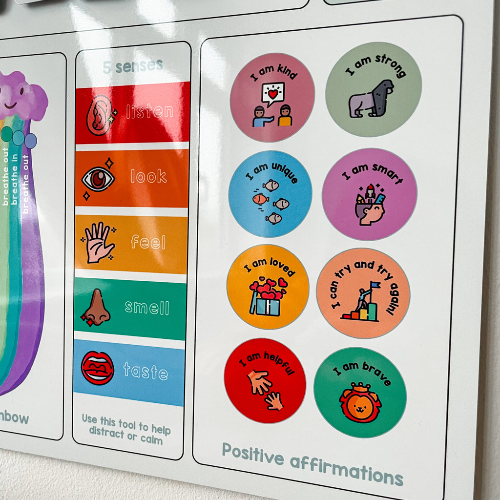 The emotions and mindfulness display boards helps children visually see the choices they have when big emotions arise. The illustrations are provide emotional literacy skills to become aware of feelings and how to mange them. It also includes mindful activities such as the breathing rainbow, to practice deep breaths. The 5 senses activity is to practice becoming aware of the senses around you to help ground yourself. The positive affirmations section is great for improving self esteem and reminding your child to be kind.