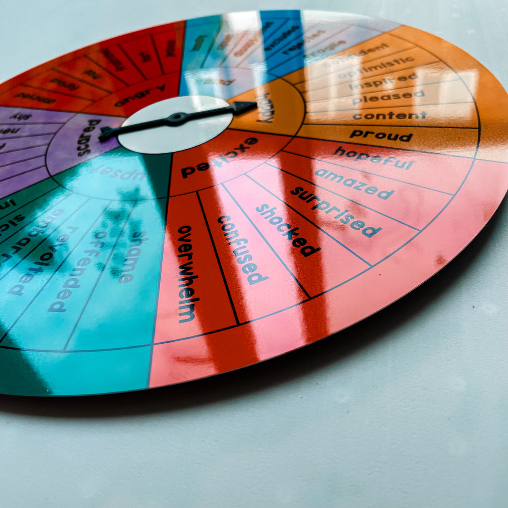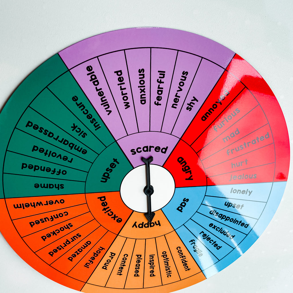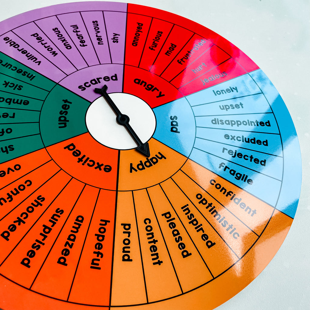 This emotions wheel is crafted to enhance your child's understanding of emotions. It allows for exploration of a wider range of feelings beyond the 6 basic ones taught in early childhood. Utilise this tool to spark discussions about various experiences and their accompanying emotions. This can help your child develop an awareness of the connection between feelings and emotions.