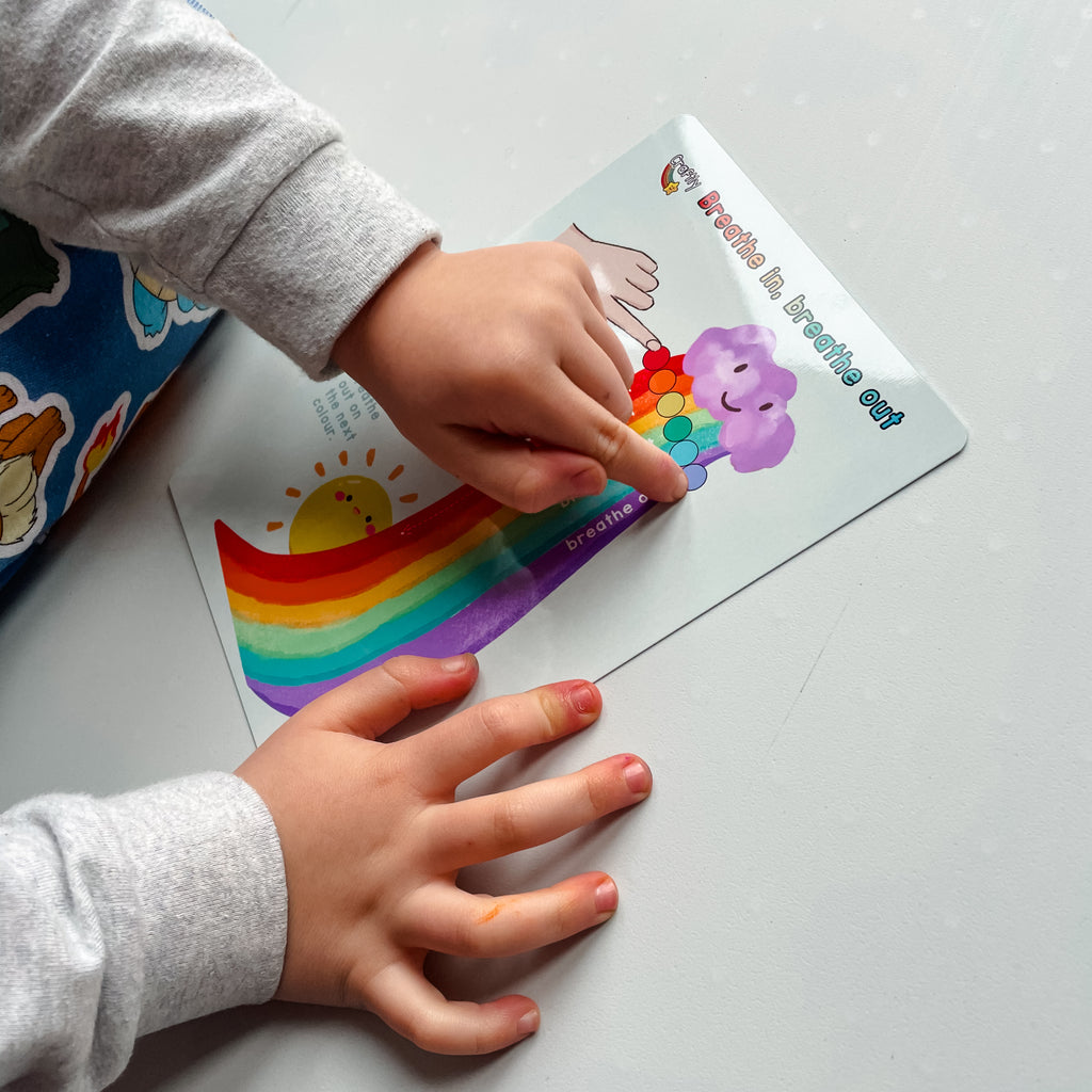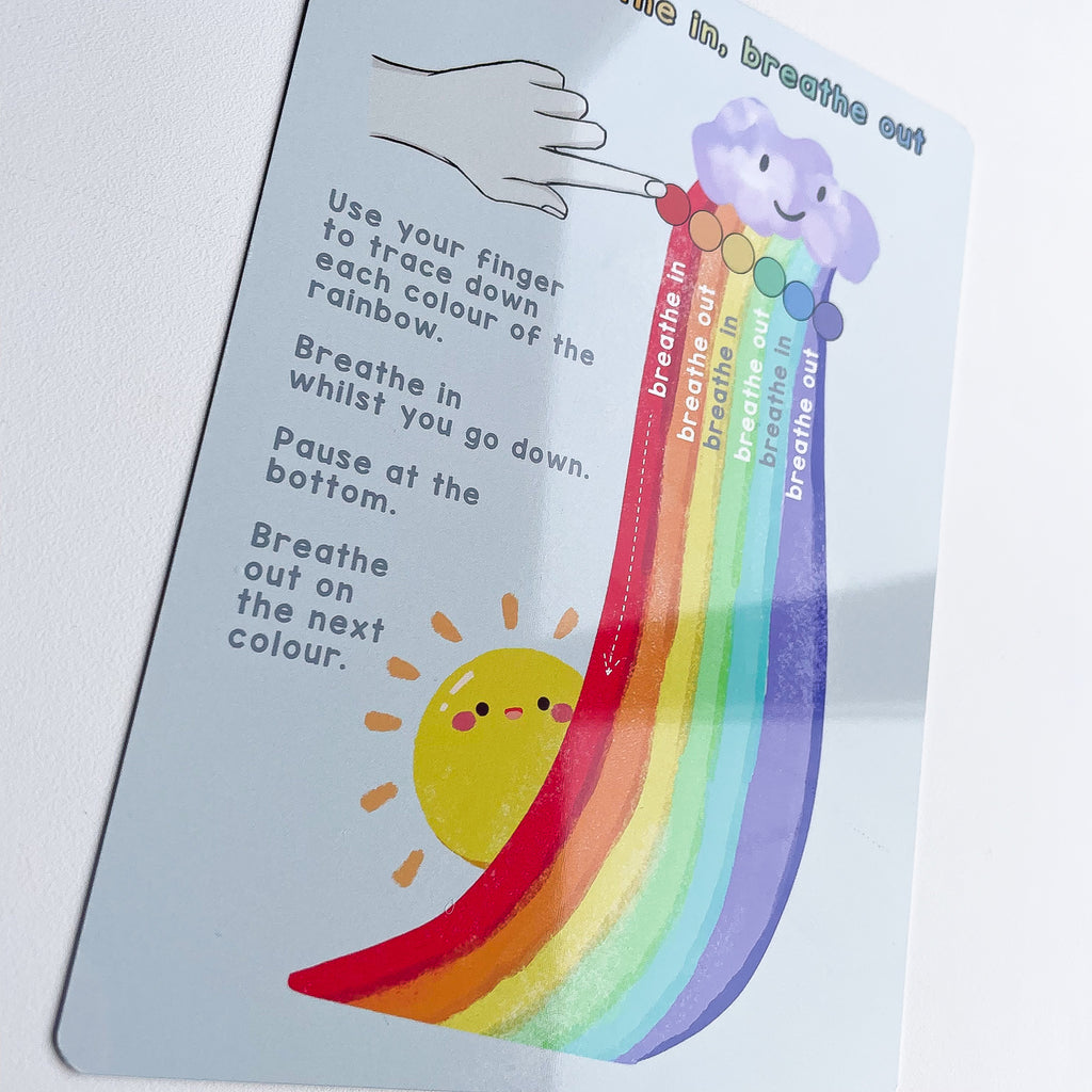 Mindful breathing is a great tool for children to calm down and self-regulate in emotional situations. This breathing rainbow board helps guide their breathing as they draw down the colours.