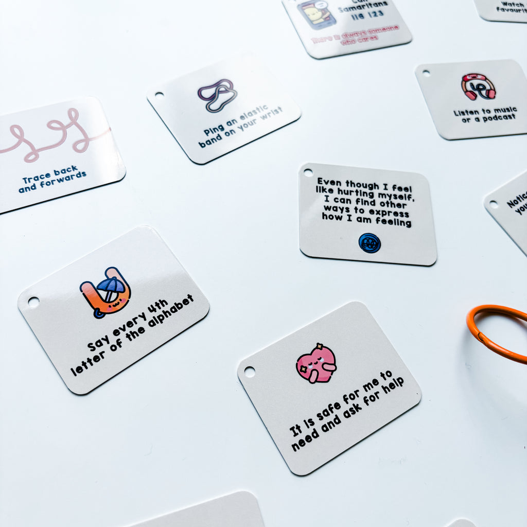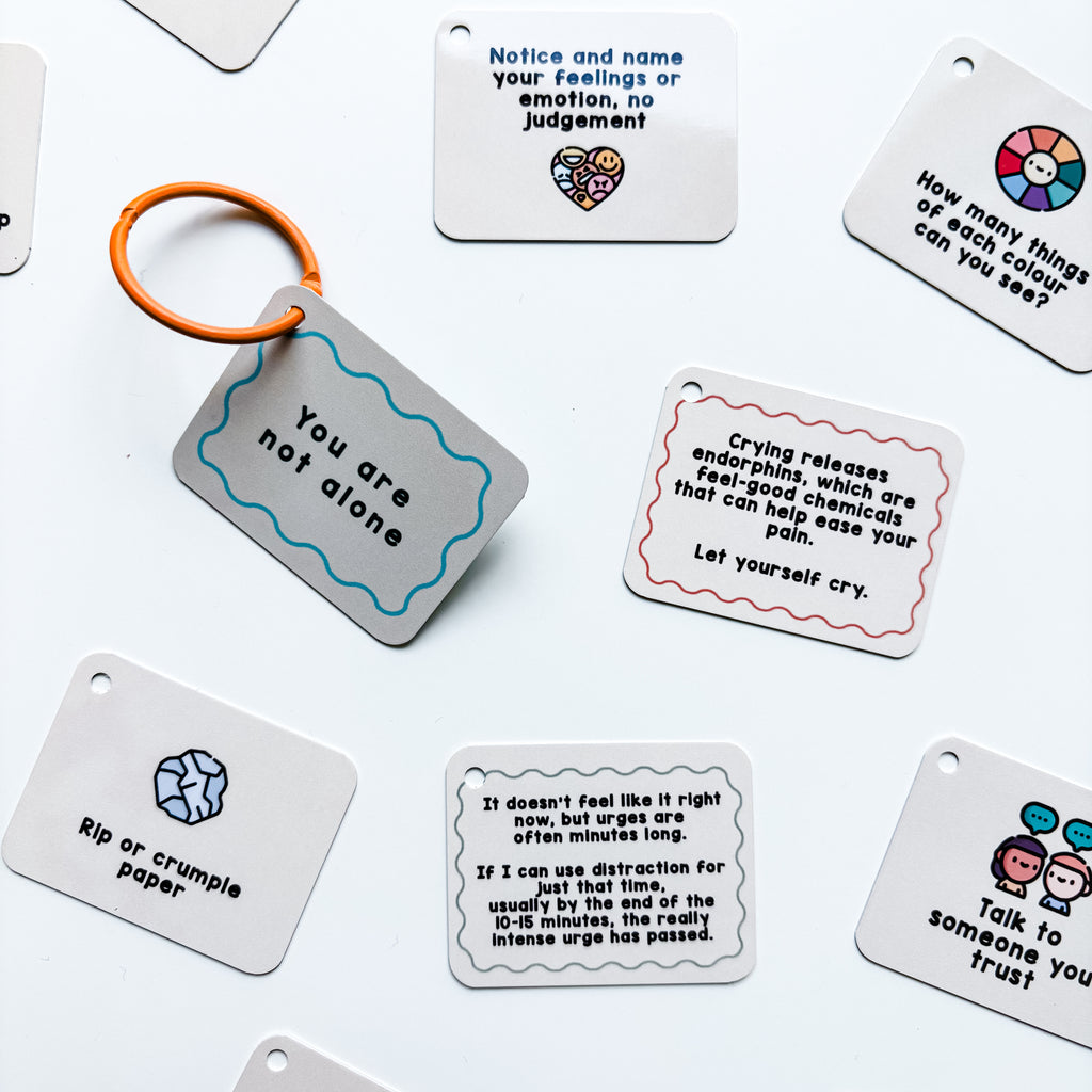 Struggling with overwhelming emotions? Need a quick way to interrupt difficult urges? This keyring is here to help. Designed with care and backed by effective coping techniques, it’s a discreet, portable toolkit packed with strategies to redirect thoughts, manage emotions, and find a sense of calm when you need it most.