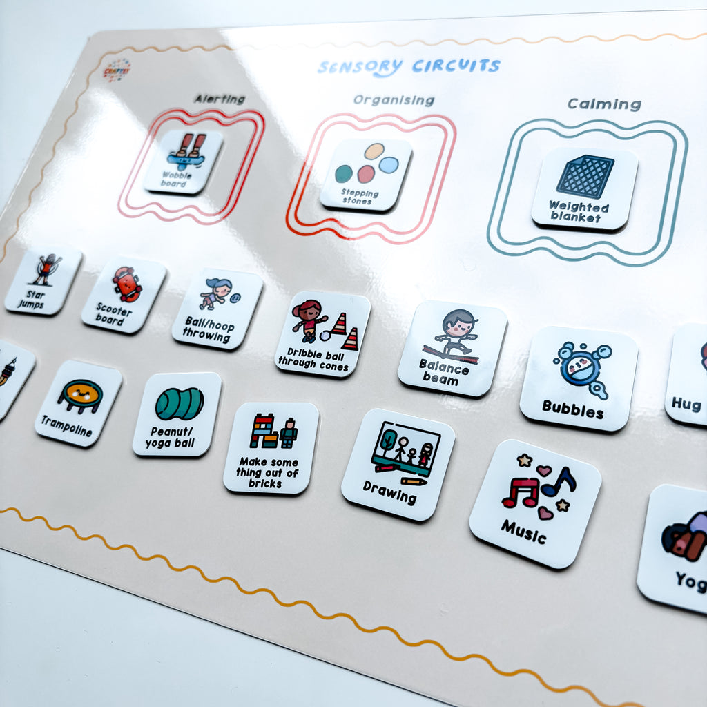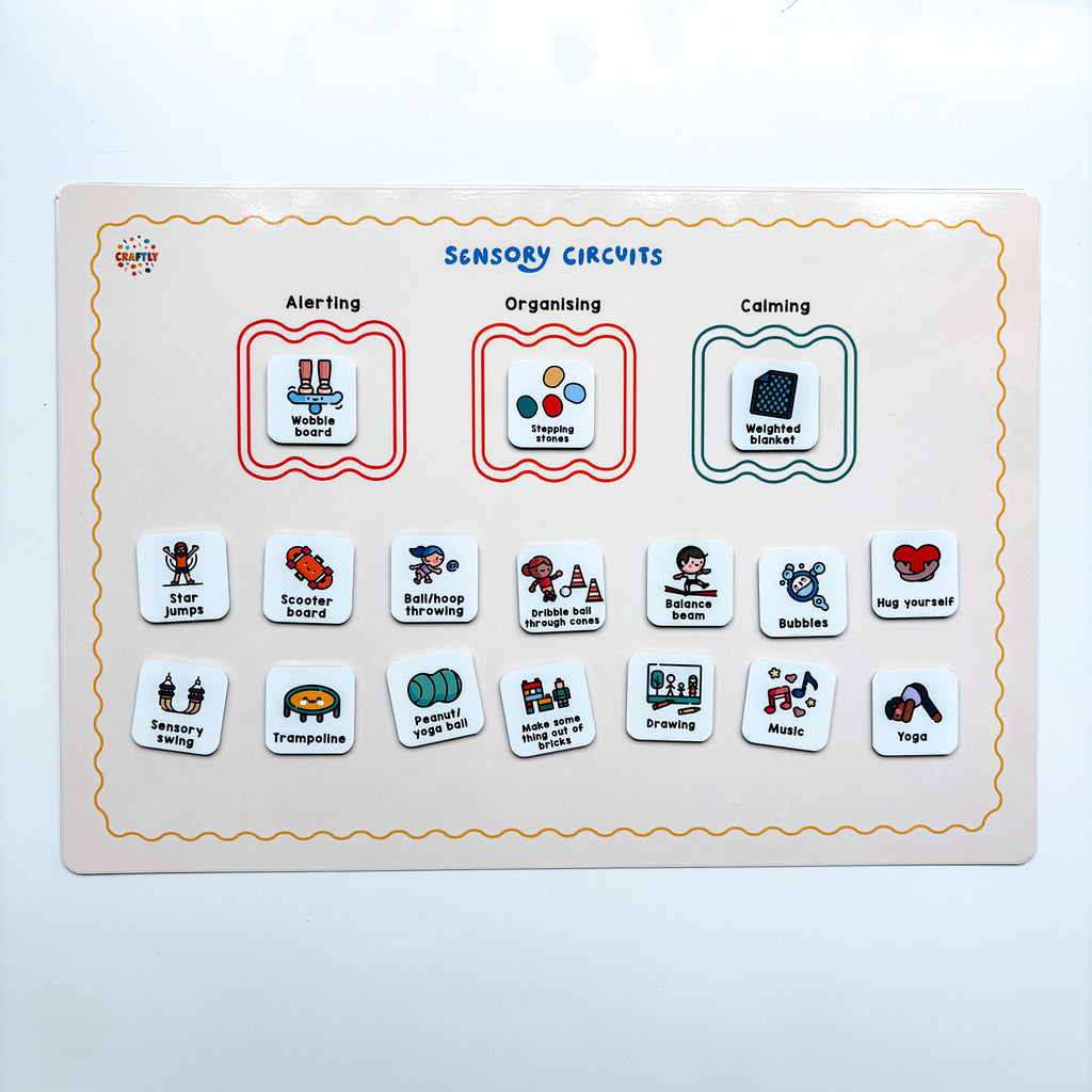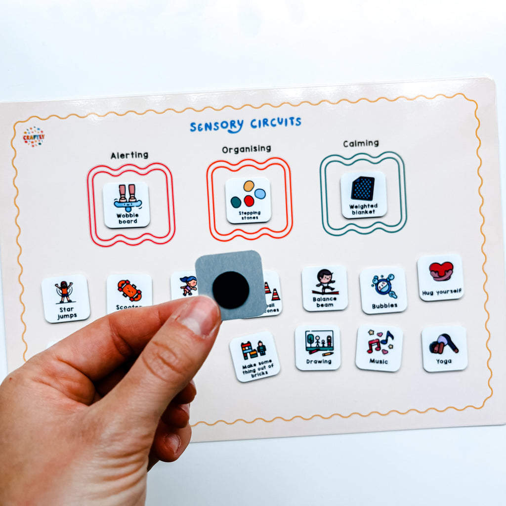 A hands-on, visual regulation tool designed to guide children and adults through sensory circuits in three clear stages: Alerting, Organising, and Calming.