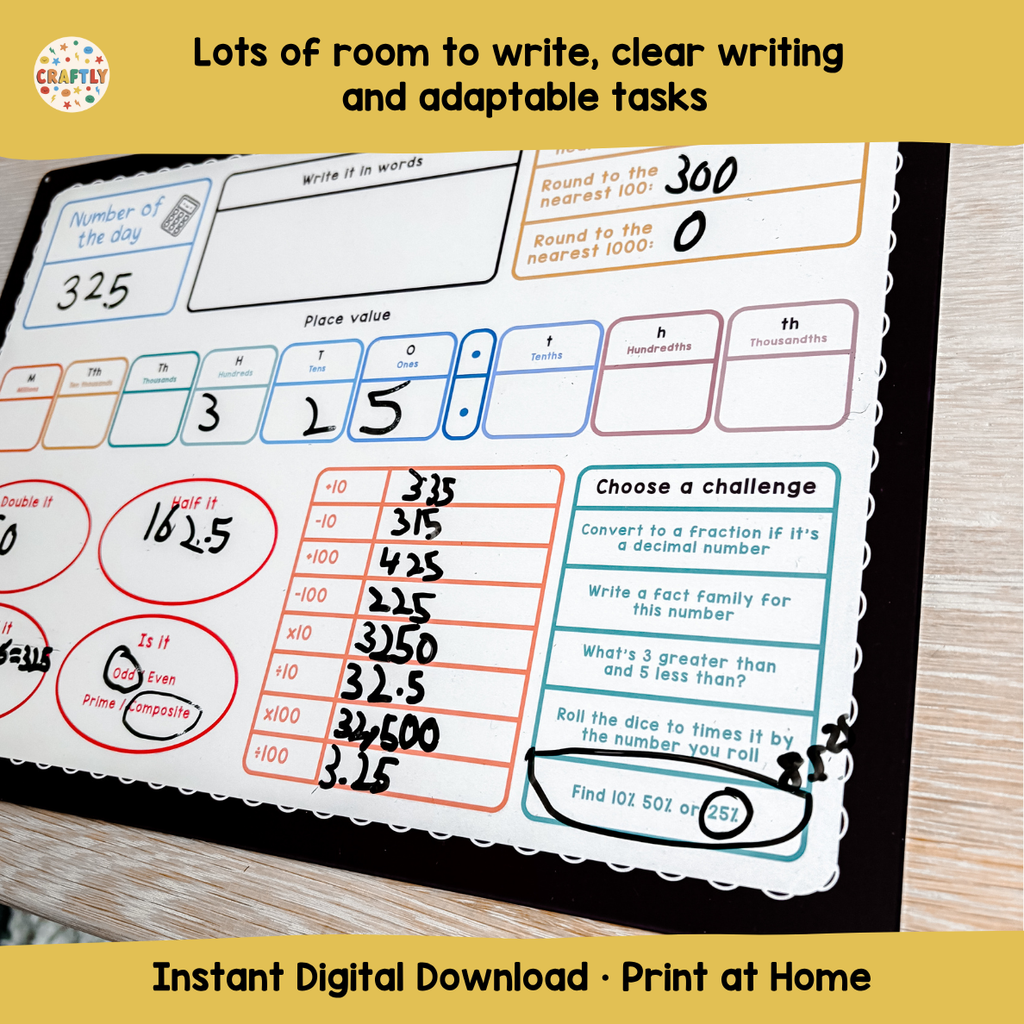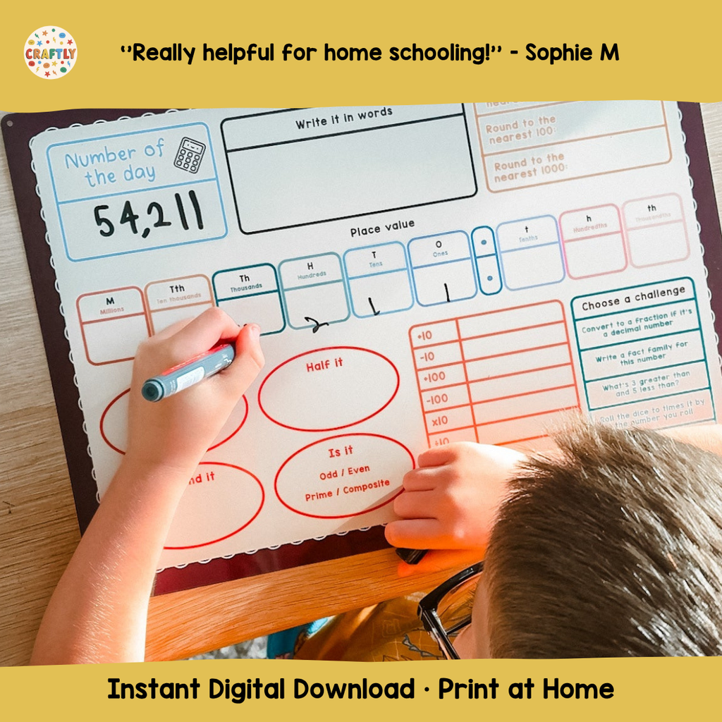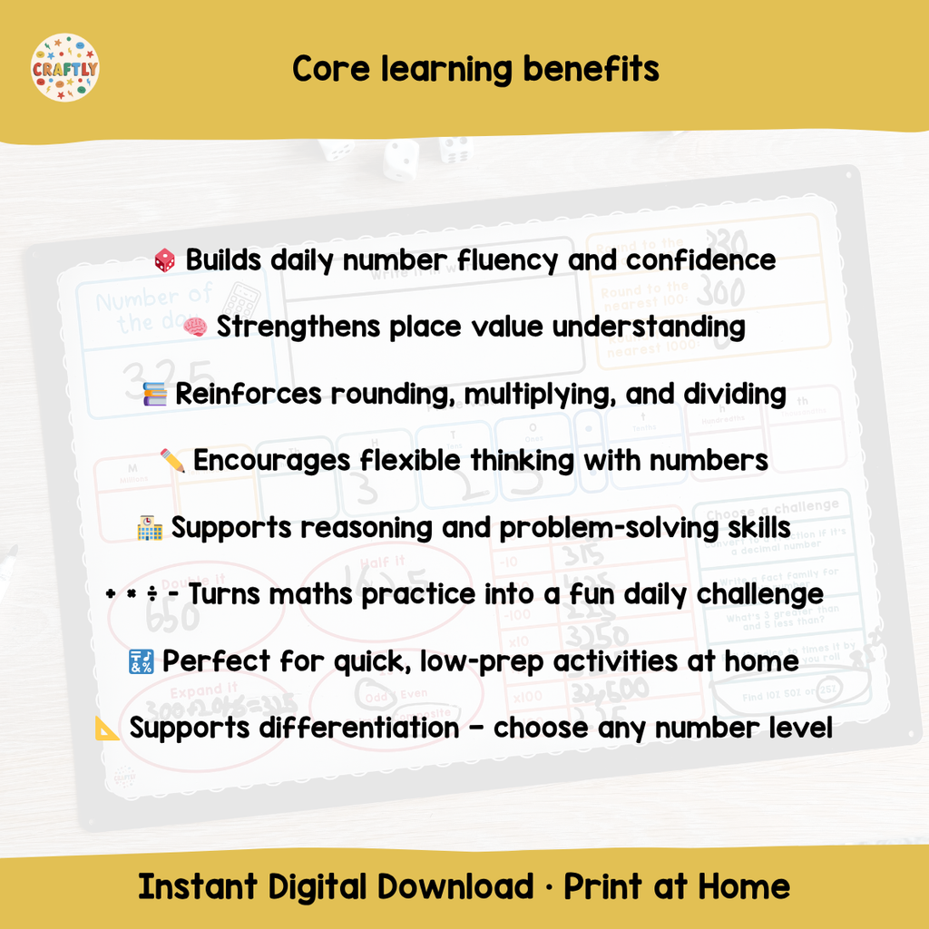 Children can roll dice to choose their number, work independently or in pairs, and complete short, focused maths tasks that strengthen their understanding of place value, rounding, multiplication, and more.