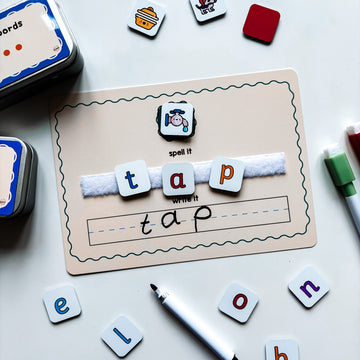 Starting at Stage 3, little learners can choose a picture token (like cat, bus, or sun), find the matching letter tokens, and spell the word on the board before writing it underneath. This tactile, visual process helps children connect sounds to letters, strengthen fine motor skills, and gain confidence in early literacy.