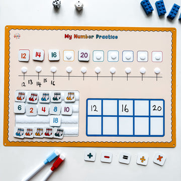 Starting from Stage 3, this board features a velcro number line, ten frame, write-and-wipe section, and a space to hold your chosen token pack — so you can easily swap between activities like counting 0–10, counting in 2s or 5s, or exploring simple sums and number patterns.