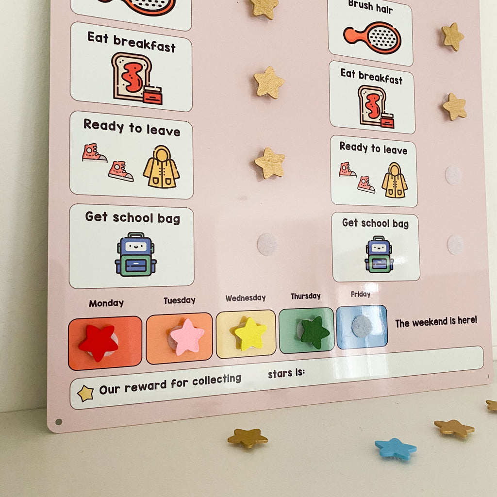 A visual picture chart to help your children independently complete tasks in the morning for the school day. Stick a golden star next to the task when finished!