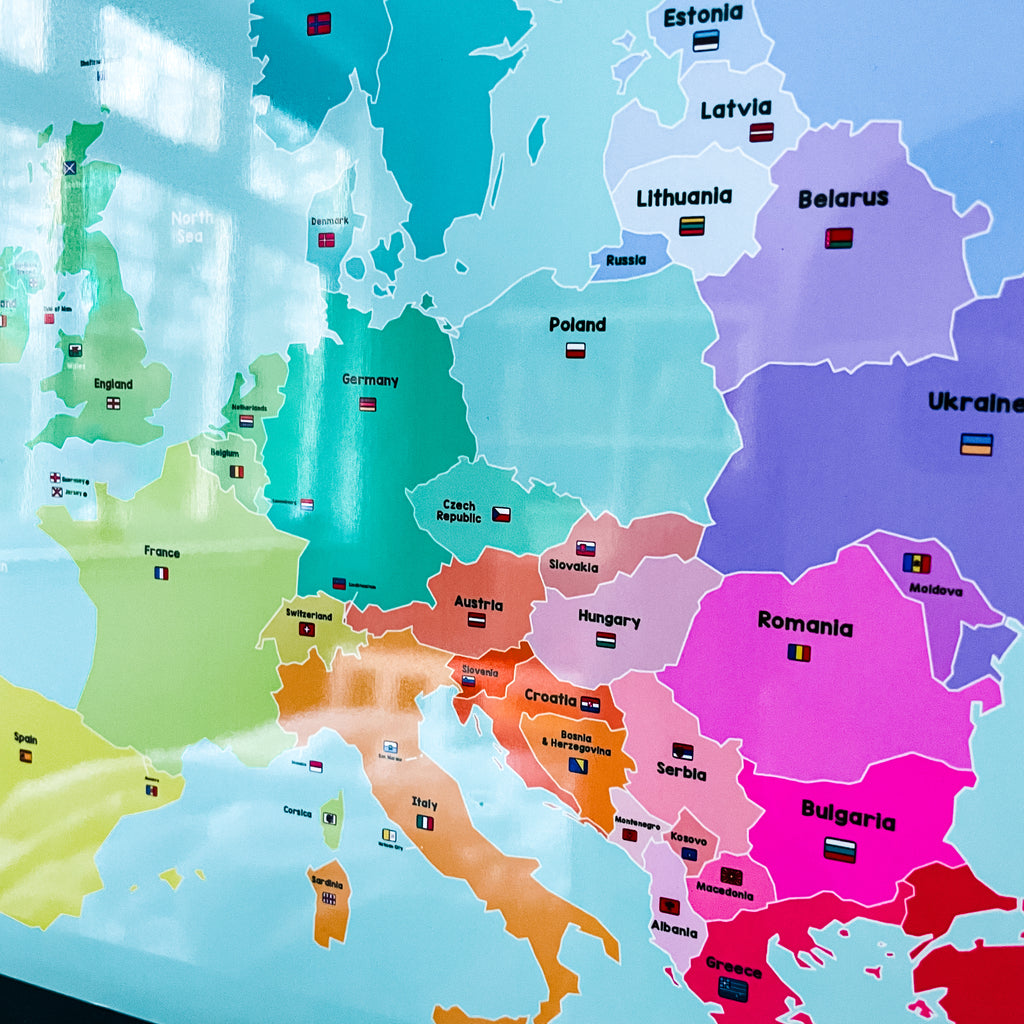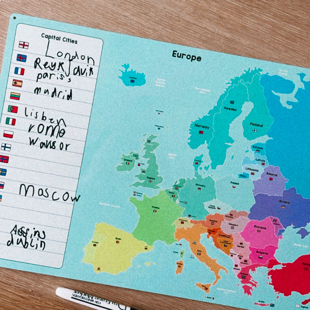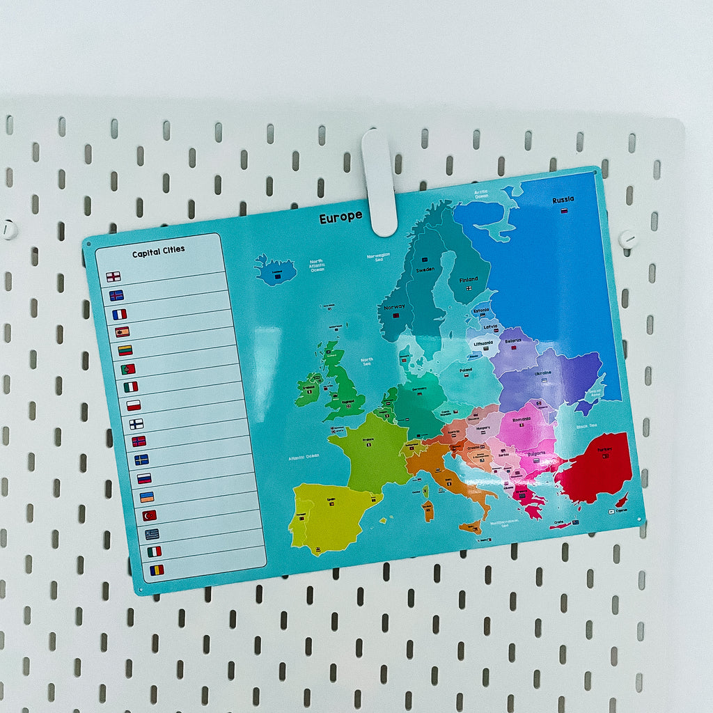 This world map is made from glossy aluminium metal for a super sturdy, long lasting product. It also means you can use a whiteboard pen and draw, colour in and doodle on it.