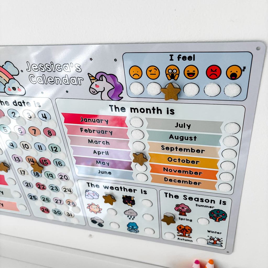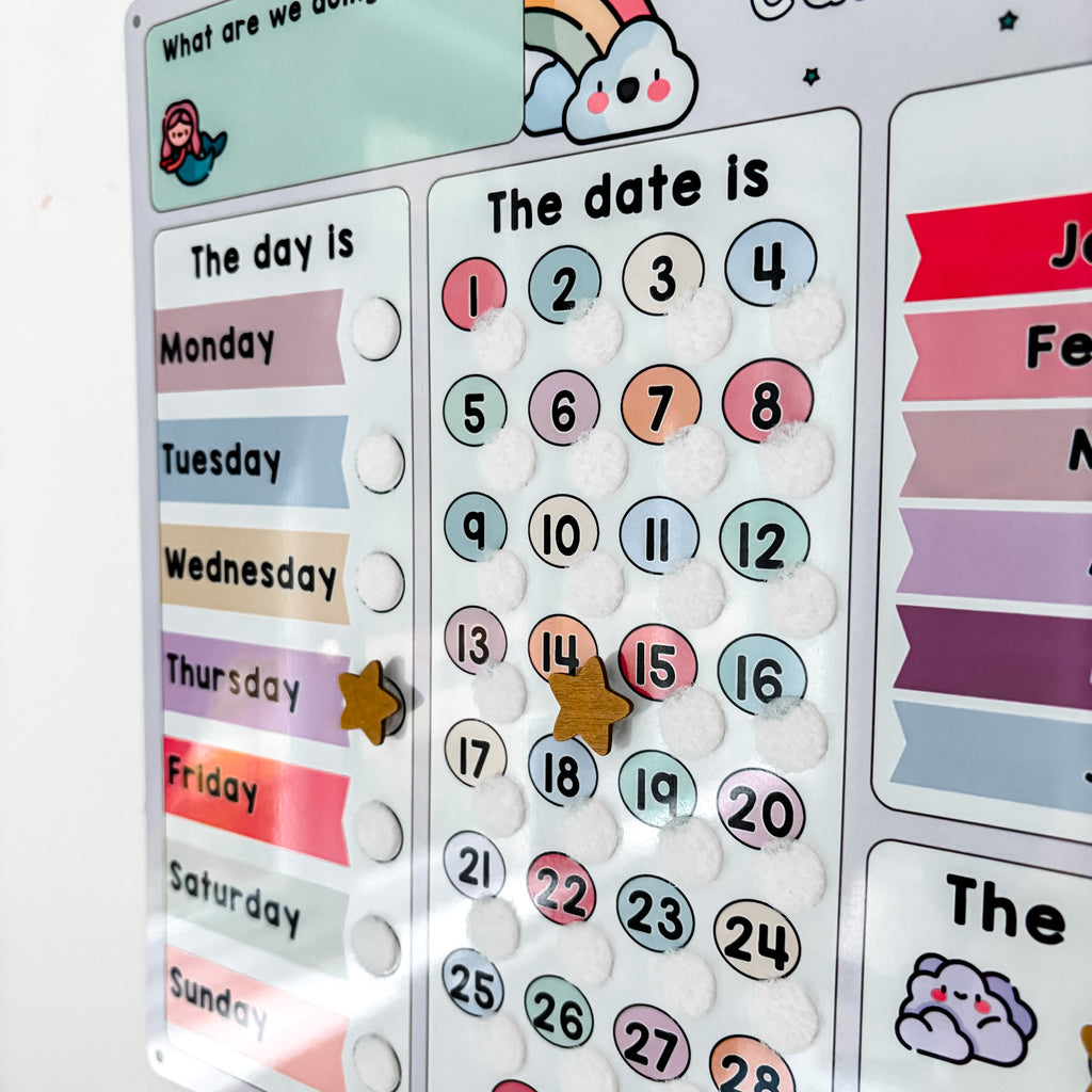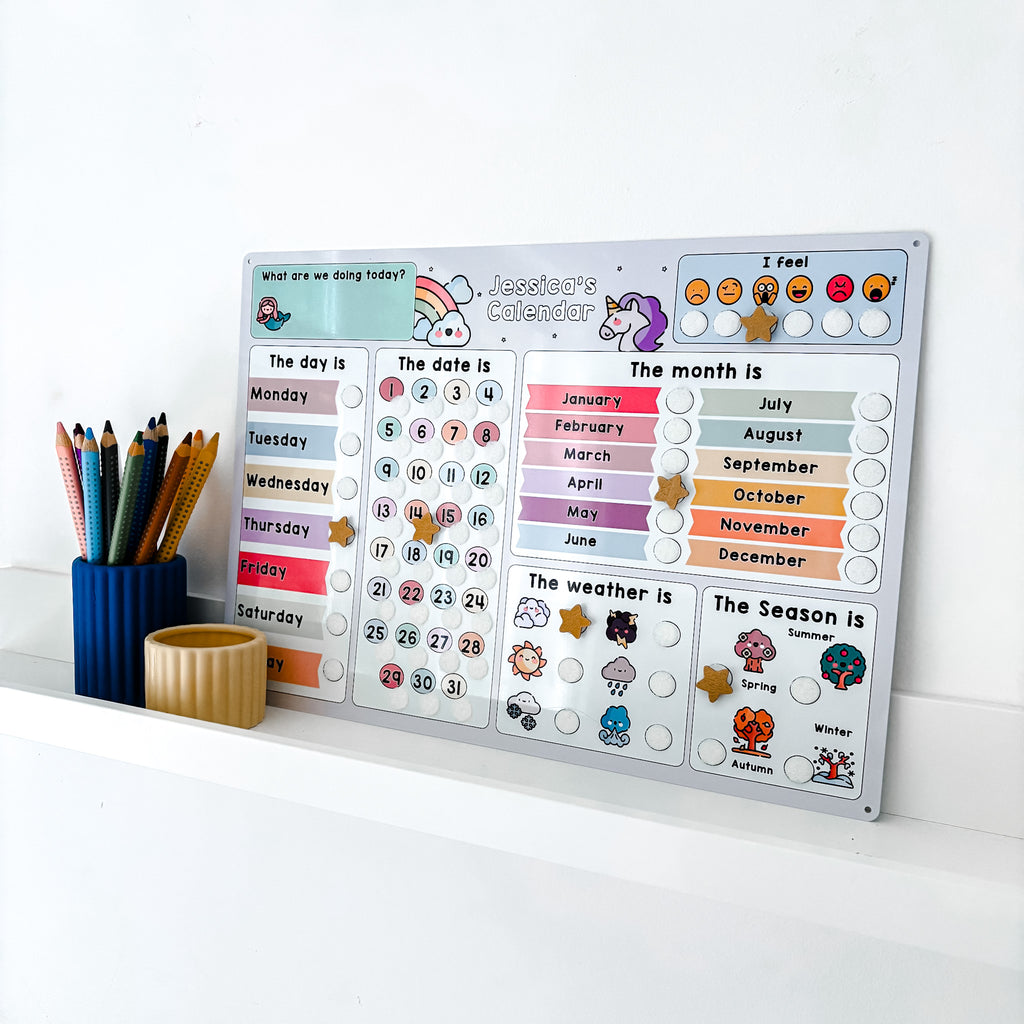 Make learning the days, dates, and seasons fun with our interactive children’s calendar and weather chart. A personalised, long-lasting gift that grows with your child. Designed to make daily routines engaging and fun.