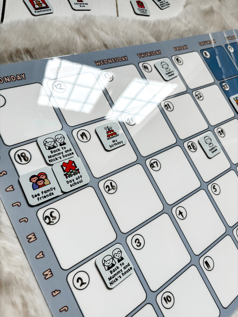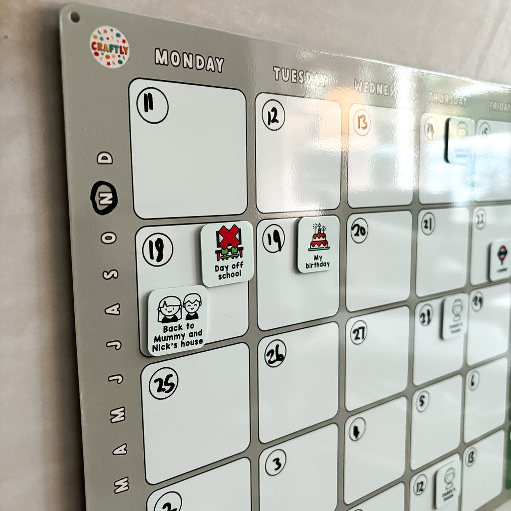 Bring clarity and calm to your month with our bespoke Monthly Visual Calendar — a sturdy aluminium board designed for real life. With a clear monthly overview, darker weekends for easy tracking, and customisable magnetic picture tokens, it makes planning simple and visual for everyone. Whether you’re a busy parent, an adult craving structure, or supporting someone with autism, ADHD or SEN, this calendar adapts to your needs and grows with your routines. Developed with input from parents, caregivers, and neurodivergent adults, it’s practical, durable, and easy to use — helping children, teens, and adults stay on top of life with confidence.