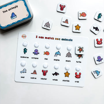 • Match the sea animals to their picture on the board to encourage focus, observation, and vocabulary building.